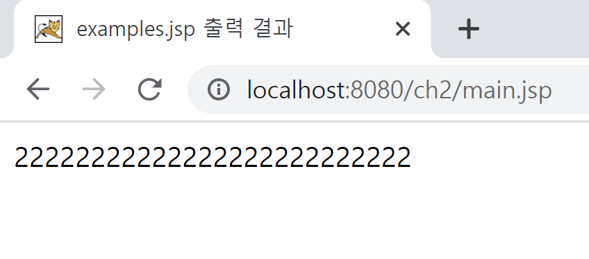 위 예제의 실행 결과를 확인해보면 main.jsp의 출력 결과는 사라지고, <jsp:forward> 액션태그를 사용해 이동한 examples.jsp의 결과가 출력되는 것을 확인할 수 있습니다. 그런데 웹 브라우저의 주소는 최초로 요청을 받은 main.jsp의 의 주소가 표시되어 있습니다.