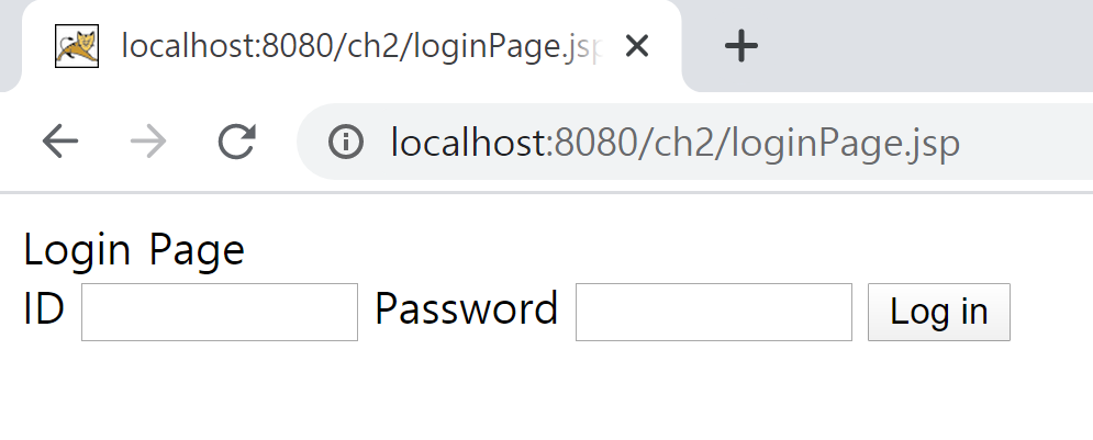 <%@ page contentType="text/html; charset=utf-8" %> <html> <head> Login Page </head> <body> <form action="<%= request.getContextPath()%>/login.jsp" method="post"> ID <input type="text" name="id" size=10 > Password <input type="password" name="password" size=10 > <input type="submit" value="Log in" > </form> </body> </html>