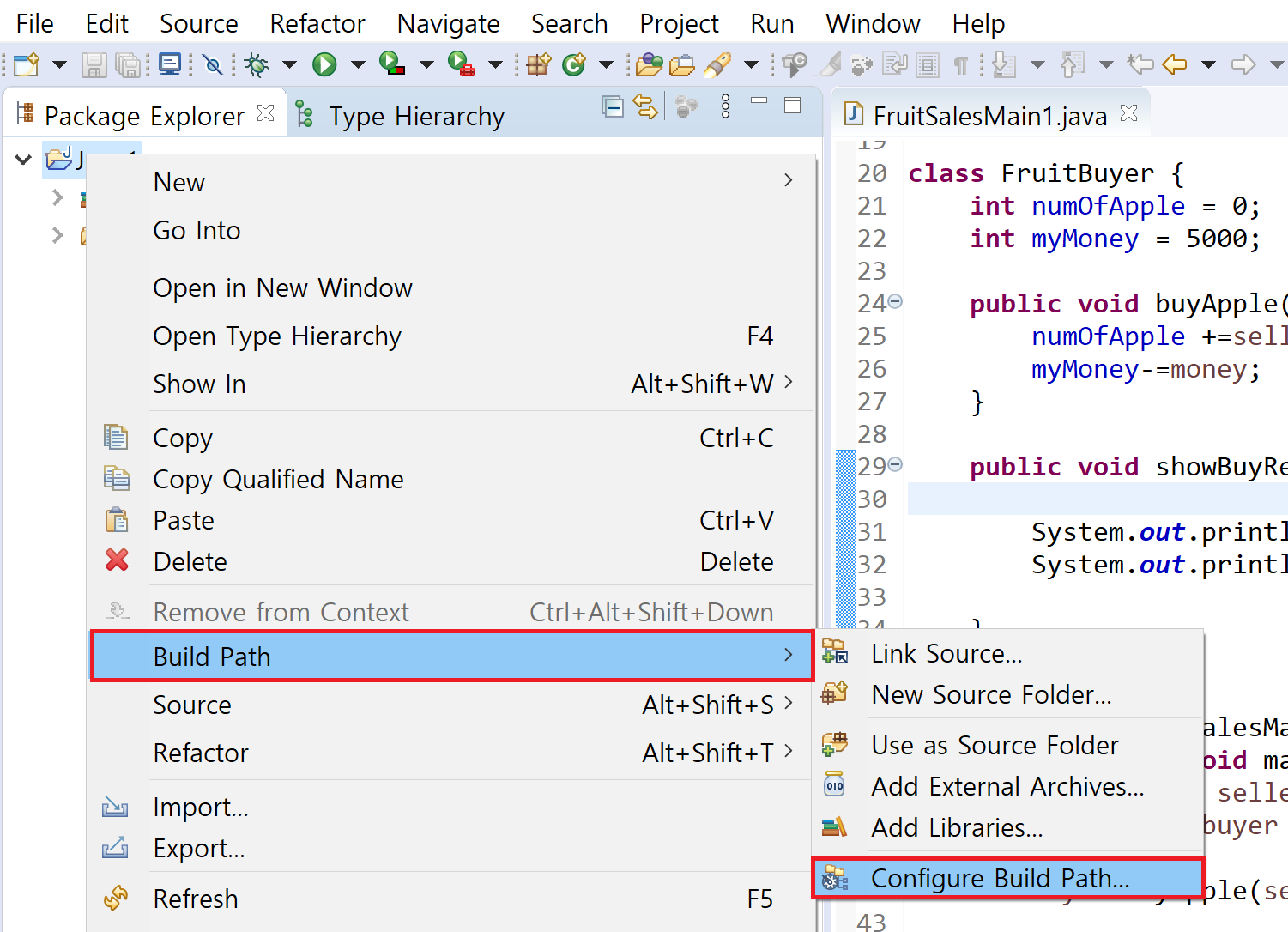 4. 이제 이클립스에서 프로젝트를 우클릭한 뒤 Build Path - Configure Build Path를 실행합니다.