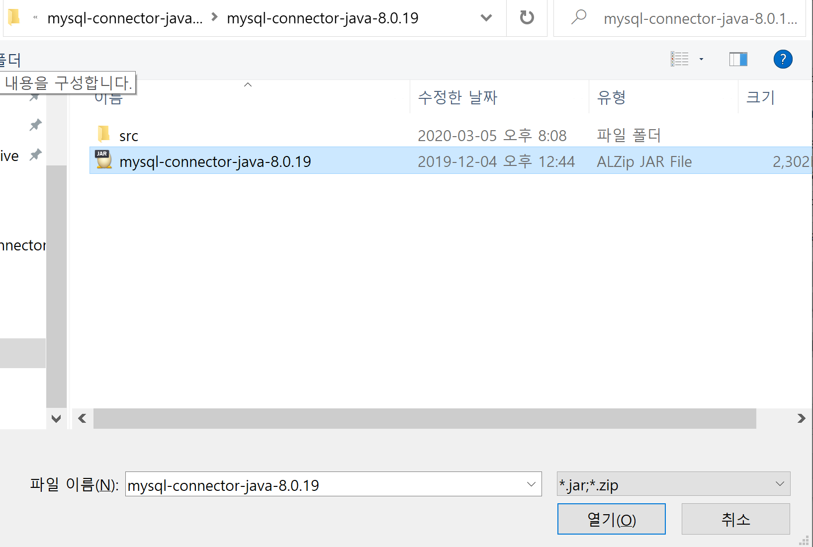 그렇기 때문에 JDBC 프로그래밍을 하기 위해서는 사용할 DBMS에 알맞은 JDBC 드라이버가 있어야 하고, 이 JDBC 드라이버는 클래스 형태로 존재하며 일반적으로 jar 파일로 제공됩니다. 저는 JDBC 프로그래밍에 앞서 MySQL 사이트에서 제공하는 mysql-connector-java-버전-bin.jar 파일에 포함된 MySQL용 JDBC 드라이버인 Connector/J를 준비했습니다.