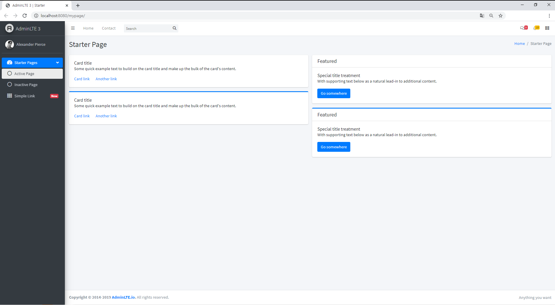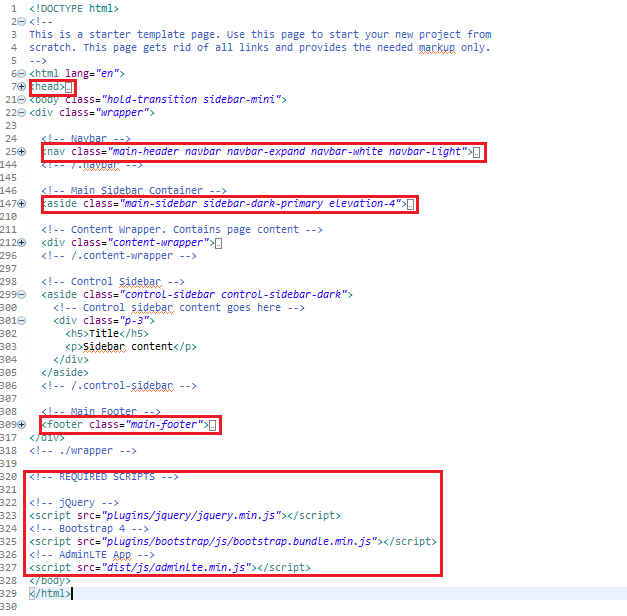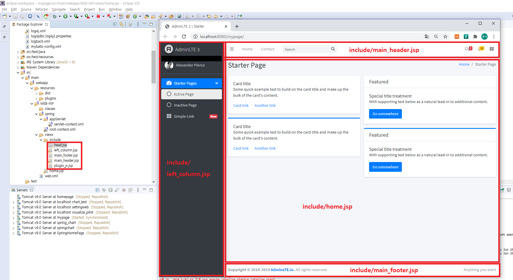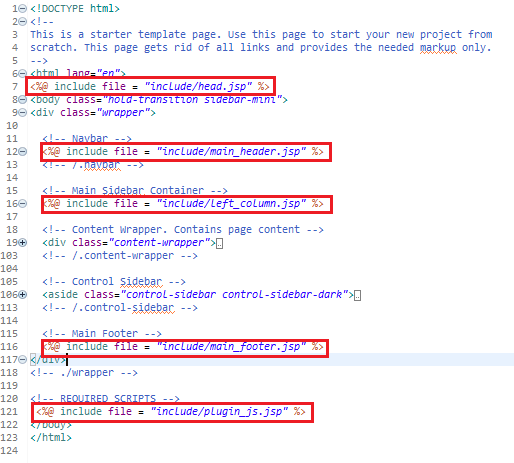 압축 해제한 AdminLTE-3.0.5 템플릿 폴더의 starter.html파일 전체 코드를 복사한 뒤 home.jsp 파일에 붙여넣습니다. 그리고 servlet-context.xml 파일에 아래와 같이 추가해줌으로써 정적자원 디렉토리를 등록해줍니다.