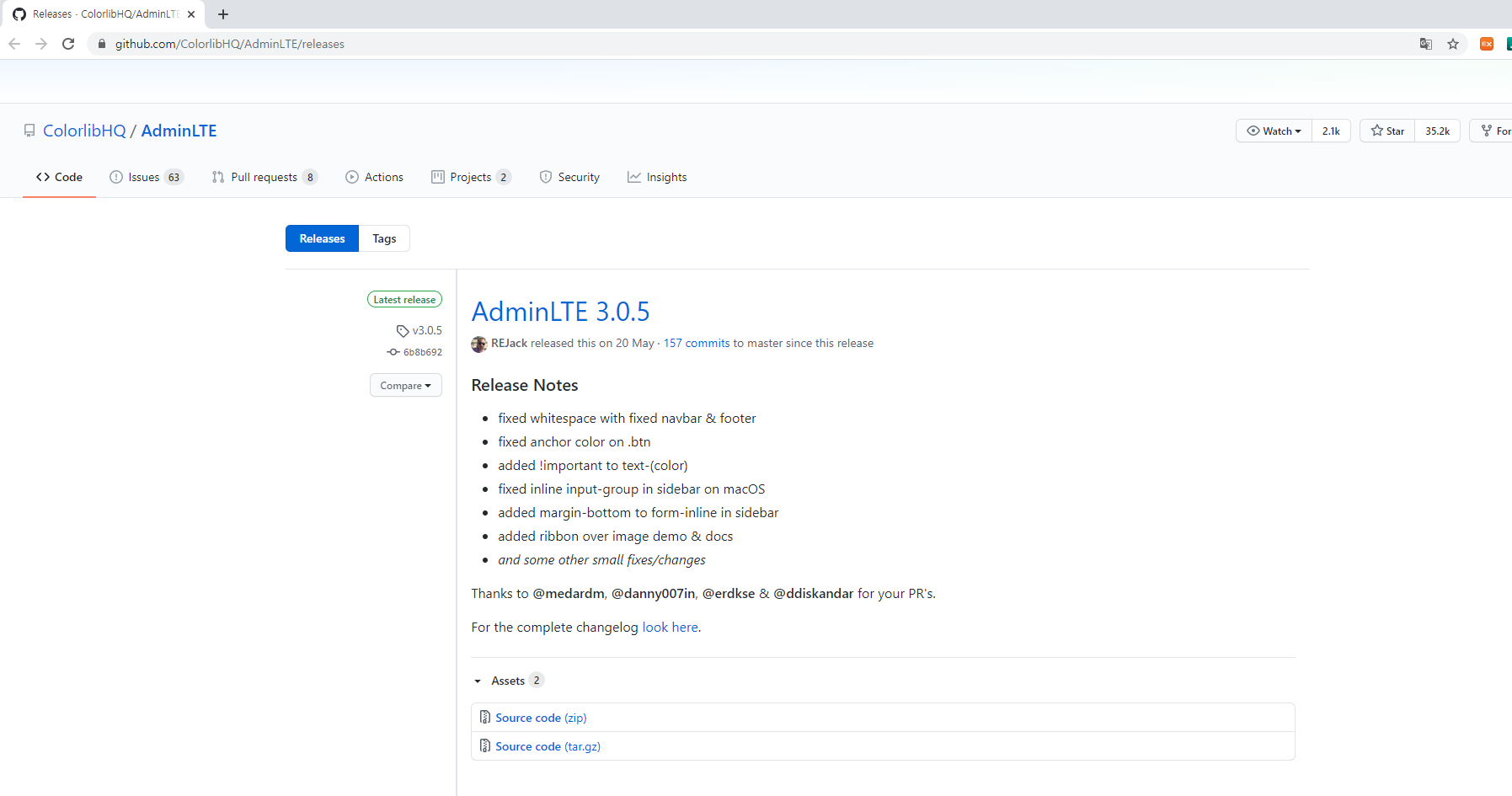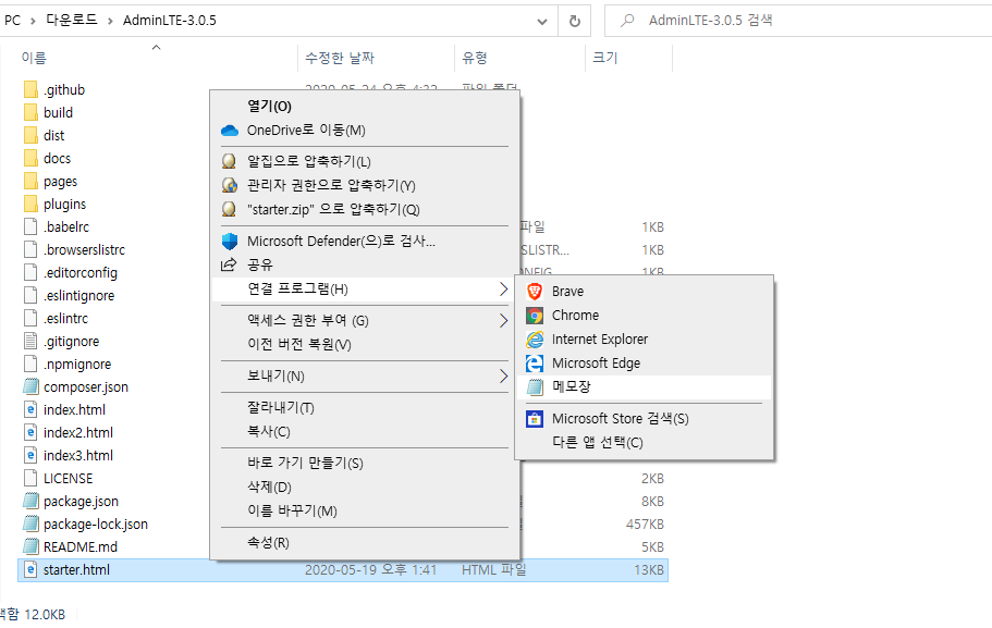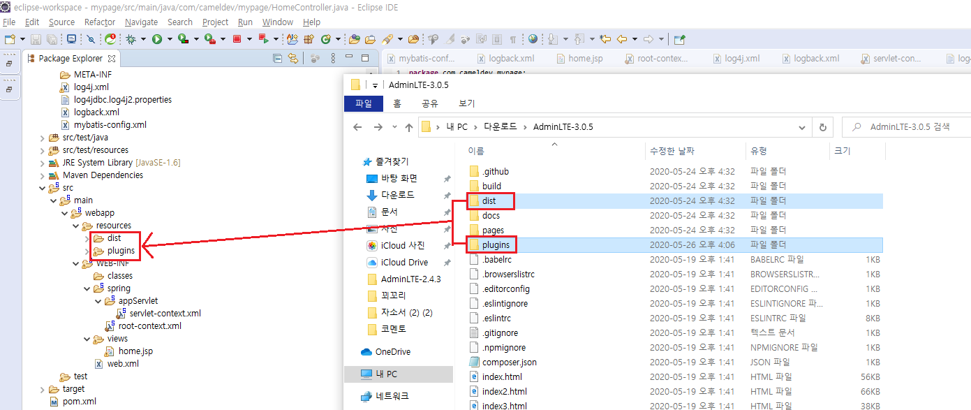 먼저 AdminLTE 3.0.5 다운로드 페이지에서 템플릿을 다운로드합니다. 다운 받은 파일을 압축해제 후 dist, plugins 폴더를 복사한 뒤 이전에 생성 및 세팅한 프로젝트의 /webapp/resources 디렉토리에 붙여넣습니다.