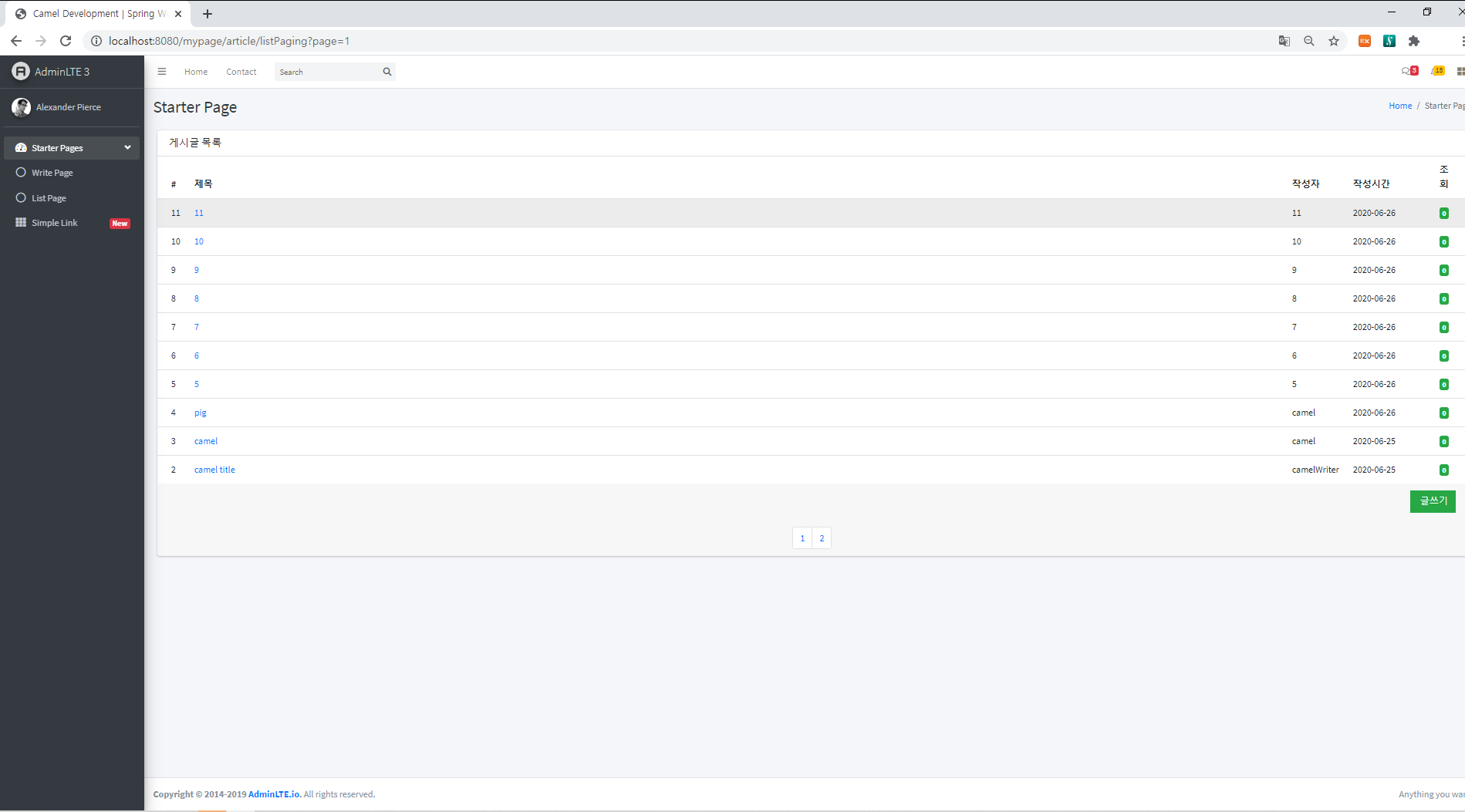 최종적으로 페이징을 구현한 결과 전체 게시물의 갯수가 11개이기 때문에 하단 페이지 목록에 2페이지 까지만 촐력되는 것을 확인 할 수 있습니다.