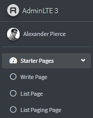 <aside class="main-sidebar sidebar-dark-primary elevation-4"> <!-- Brand Logo --> <a href="index3.html" class="brand-link"> <img src="${path}/dist/img/AdminLTELogo.png" alt="AdminLTE Logo" class="brand-image img-circle elevation-3" style="opacity: .8"> <span class="brand-text font-weight-light">AdminLTE 3</span> </a> <!-- Sidebar --> <div class="sidebar"> <!-- Sidebar user panel (optional) --> <div class="user-panel mt-3 pb-3 mb-3 d-flex"> <div class="image"> <img src="${path}/dist/img/user2-160x160.jpg" class="img-circle elevation-2" alt="User Image"> </div> <div class="info"> <a href="#" class="d-block">Alexander Pierce</a> </div> </div> <!-- Sidebar Menu --> <nav class="mt-2"> <ul class="nav nav-pills nav-sidebar flex-column" data-widget="treeview" role="menu" data-accordion="false"> <!-- Add icons to the links using the .nav-icon class with font-awesome or any other icon font library --> <li class="nav-item has-treeview menu-open"> <a href="#" class="nav-link"> <i class="nav-icon fas fa-tachometer-alt"></i> <p> Starter Pages <i class="right fas fa-angle-left"></i> </p> </a> <ul class="nav nav-treeview"> <li class="nav-item"> <a href="${path}/article/write" class="nav-link"> <i class="far fa-circle nav-icon"></i> <p>Write Page</p> </a> </li> <li class="nav-item"> <a href="${path}/article/list" class="nav-link"> <i class="far fa-circle nav-icon"></i> <p>List Page</p> </a> </li> <!-- List Paging 목록 버튼 추가 --> <li class="nav-item"> <a href="${path}/article/listPaging" class="nav-link"> <i class="far fa-circle nav-icon"></i> <p>List Paging Page</p> </a> </li> <!-- ------------------------- --> </ul> </li> <li class="nav-item"> <a href="#" class="nav-link"> <i class="nav-icon fas fa-th"></i> <p> Simple Link <span class="right badge badge-danger">New</span> </p> </a> </li> </ul> </nav> <!-- /.sidebar-menu --> </div> <!-- /.sidebar --> </aside>
