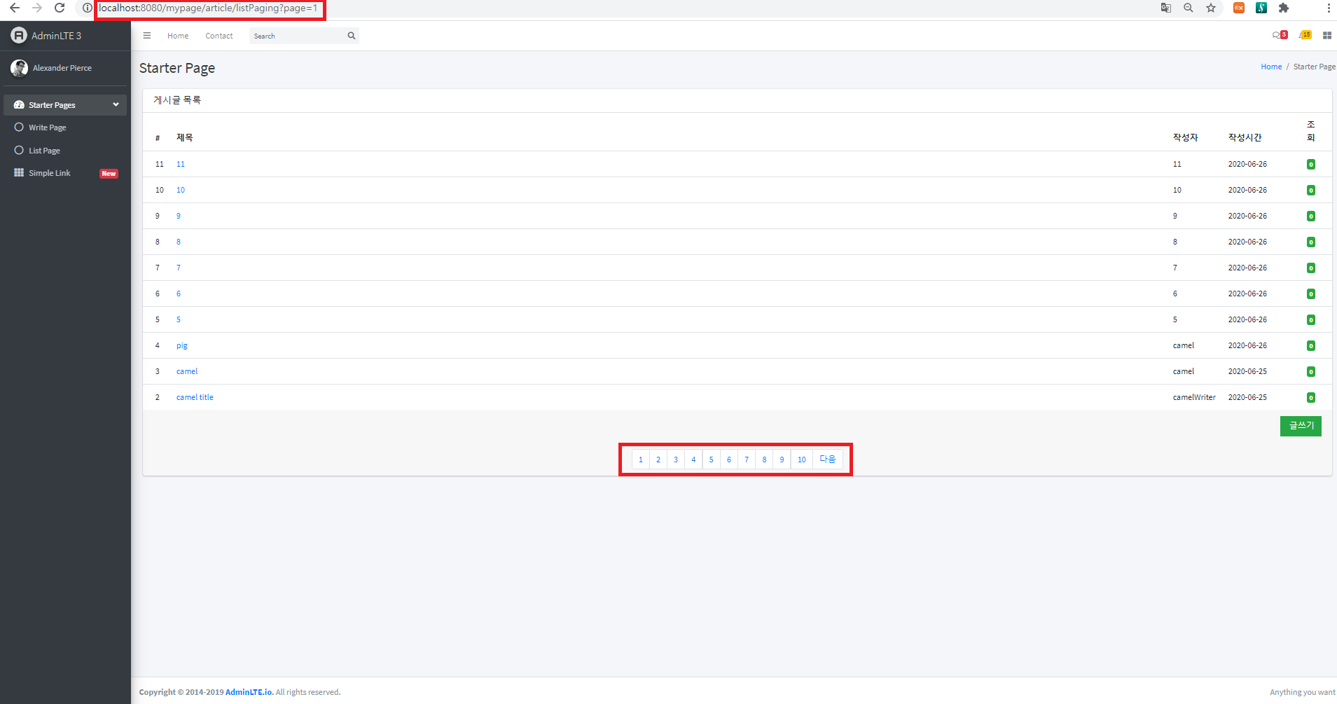 @RequestMapping(value = "/listPaging", method = RequestMethod.GET) public String listPaging(Model model, Criteria criteria) throws Exception { logger.info("listPaging ..."); PageMaker pageMaker = new PageMaker(); pageMaker.setCriteria(criteria); pageMaker.setTotalCount(1000); model.addAttribute("articles", articleService.listCriteria(criteria)); model.addAttribute("pageMaker", pageMaker); return "/article/list_paging"; }<div class="card-footer"> <nav aria-label="Contacts Page Navigation"> <ul class="pagination justify-content-center m-0"> <c:if test="${pageMaker.prev}"> <li class="page-item"><a class="page-link" href="${path}/article/listPaging?page=${pageMaker.startPage - 1}">이전</a></li> </c:if> <c:forEach begin="${pageMaker.startPage}" end="${pageMaker.endPage}" var="idx"> <li class="page-item" <c:out value="${pageMaker.criteria.page == idx ? 'class=active' : ''}"/>> <a class="page-link" href="${path}/article/listPaging?page=${idx}">${idx}</a> </li> </c:forEach> <c:if test="${pageMaker.next && pageMaker.endPage > 0}"> <li class="page-item"><a class="page-link" href="${path}/article/listPaging?page=${pageMaker.endPage + 1}">다음</a></li> </c:if> </ul> </nav> </div>위의 코드를 추가하면 드디어 아래와 같은 결과를 확인할 수 있습니다.
