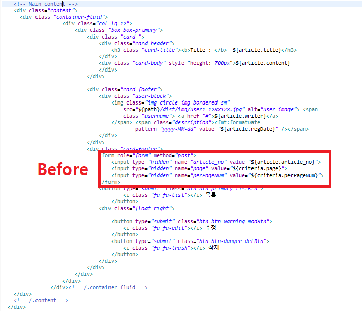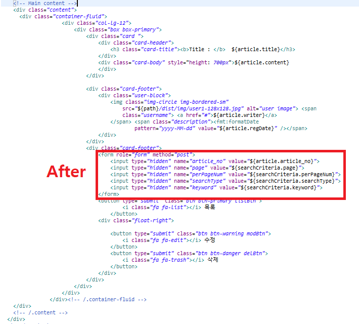 $(document).ready(function () { var formObj = $("form[role='form']"); console.log(formObj); $(".modBtn").on("click", function () { formObj.attr("action", "${path}/article/paging/search/modify"); formObj.attr("method", "get"); formObj.submit(); }); $(".delBtn").on("click", function () { formObj.attr("action", "${path}/article/paging/search/remove"); formObj.submit(); }); $(".listBtn").on("click", function () { formObj.attr("action", "${path}/article/paging/search/list"); formObj.attr("method", "get"); formObj.submit(); }); });8-3. modify.jsp (Main Content부분)