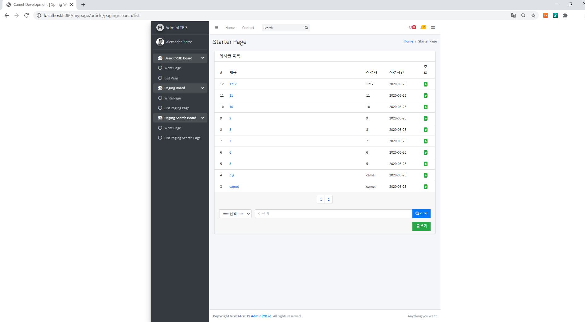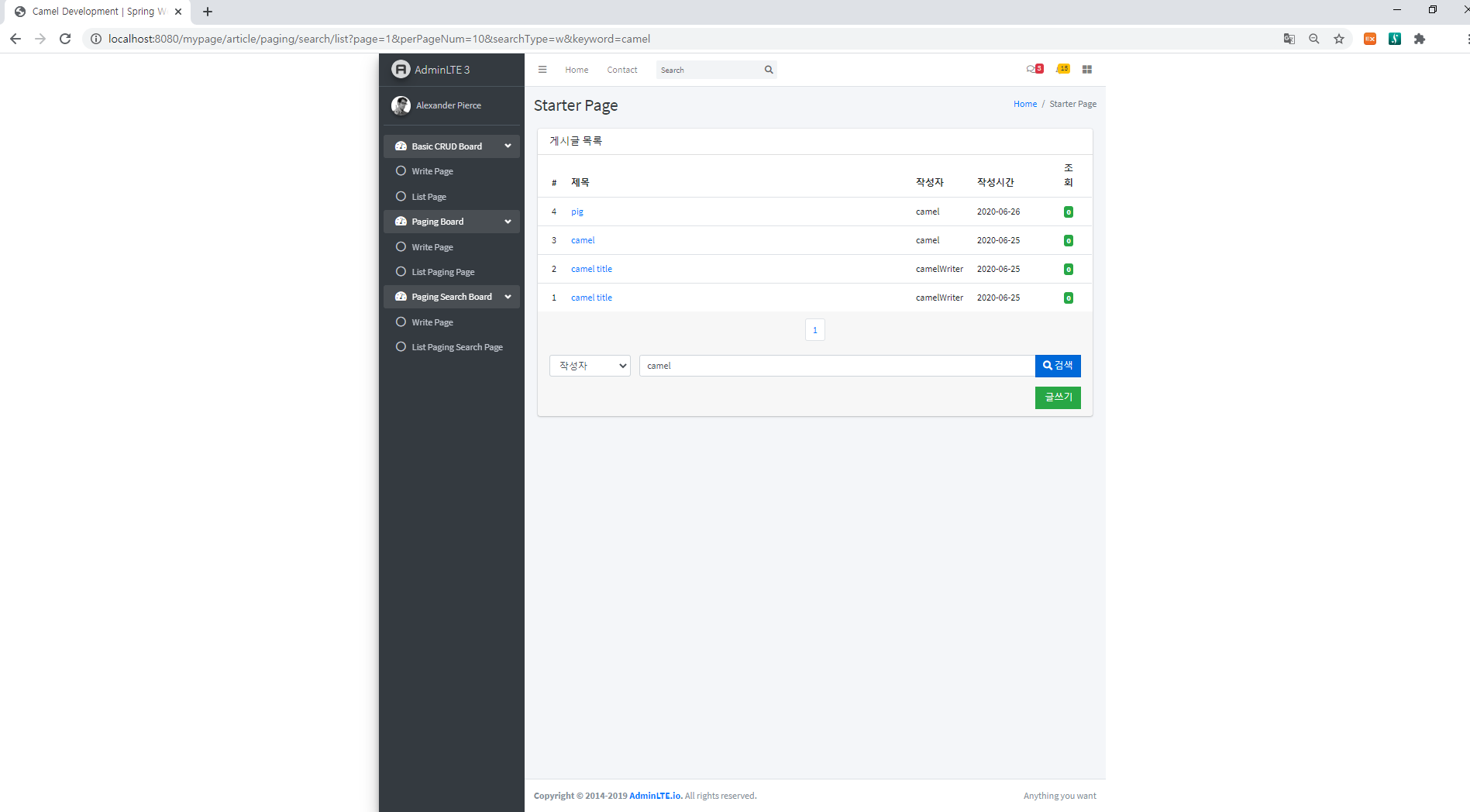 <li class="nav-item has-treeview menu-open"> <a href="#" class="nav-link"> <i class="nav-icon fas fa-tachometer-alt"></i> <p> Paging Search Board <i class="right fas fa-angle-left"></i> </p> </a> <ul class="nav nav-treeview"> <li class="nav-item"> <a href="${path}/article/paging/search/write" class="nav-link"> <i class="far fa-circle nav-icon"></i> <p>Write Page</p> </a> </li> <!-- List Paging 목록 버튼 추가 --> <li class="nav-item"> <a href="${path}/article/paging/search/list" class="nav-link"> <i class="far fa-circle nav-icon"></i> <p>List Paging Search Page</p> </a> </li> </ul> </li>9. 최종 구현 모습