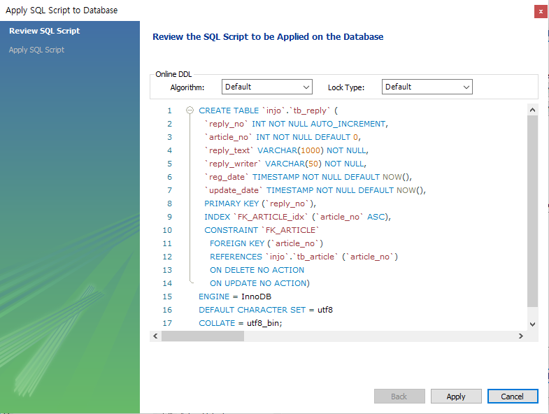 CREATE TABLE 스키마명.tb_reply ( reply_no INT NOT NULL AUTO_INCREMENT, article_no INT NOT NULL DEFAULT 0, reply_text VARCHAR(1000) NOT NULL, reply_writer VARCHAR(50) NOT NULL, reg_date TIMESTAMP NOT NULL DEFAULT NOW(), update_date TIMESTAMP NOT NULL DEFAULT NOW(), PRIMARY KEY (reply_no) ); ALTER TABLE 스키마명.tb_reply ADD CONSTRAINT FK_ARTICLE FOREIGN KEY (article_no) REFERENCES 스키마명.tb_article (article_no);저는 MySQL Workbench를 사용하여 위의 SQL문을 직접입력하지 않고 아래와 같은 방법으로 댓글 테이블을 생성하였습니다.
