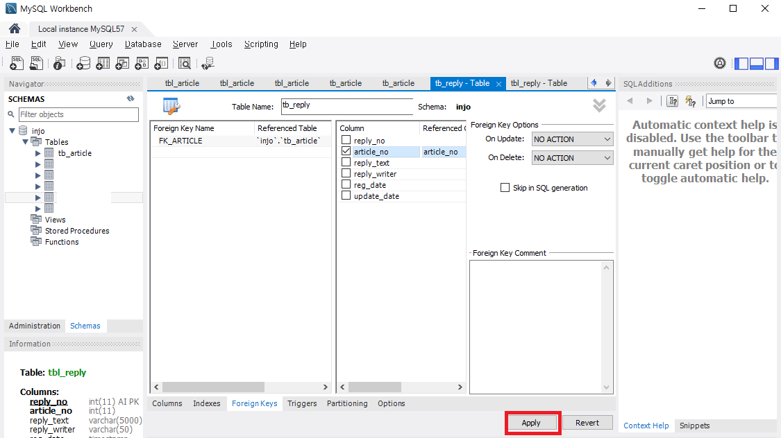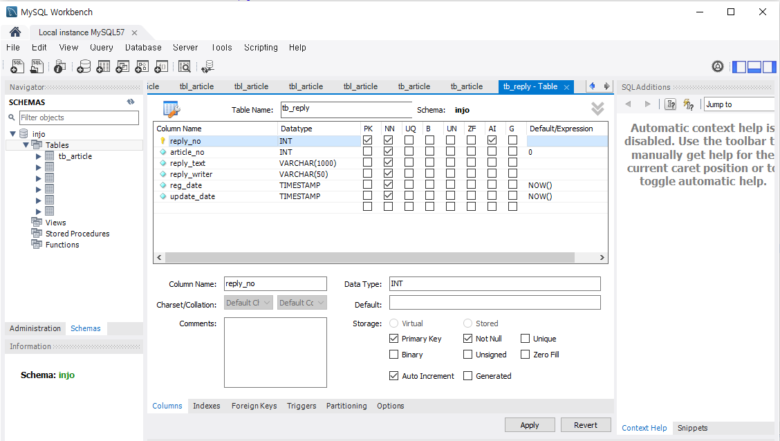 저는 MySQL Workbench를 사용하여 위의 SQL문을 직접입력하지 않고 아래와 같은 방법으로 댓글 테이블을 생성하였습니다.
