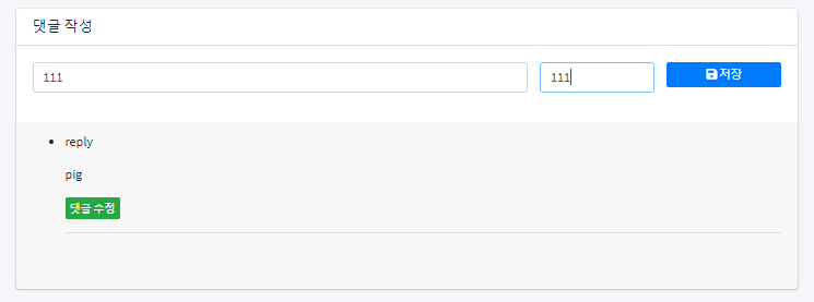 <button type='button' class='btn btn-xs btn-success' data-toggle='modal' data-target='#modifyModal'> 댓글 수정 </button>또한 테스트 페이지를 작성하면서 미리 작성해둔 modal 영역은 댓글 수정과 삭제를 위한 영역입니다.