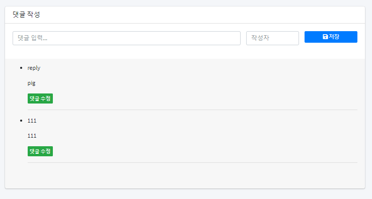 <div class="col-lg-12"> <div class="card"> <div class="card-header with-border"> <h3 class="card-title">댓글 작성</h3> </div> <div class="card-body"> <div class="row"> <div class="form-group col-sm-8"> <input class="form-control input-sm" id="newReplyText" type="text" placeholder="댓글 입력..."> </div> <div class="form-group col-sm-2"> <input class="form-control input-sm" id="newReplyWriter" type="text" placeholder="작성자"> </div> <div class="form-group col-sm-2"> <button type="button" class="btn btn-primary btn-sm btn-block replyAddBtn"> <i class="fa fa-save"></i> 저장 </button> </div> </div> </div> <div class="card-footer"> <ul id="replies"> </ul> </div> <div class="card-footer"> <nav aria-label="Contacts Page Navigation"> <ul class="pagination pagination-sm no-margin justify-content-center m-0"> </ul> </nav> </div> </div> </div> <div class="modal fade" id="modifyModal" role="dialog"> <div class="modal-dialog"> <div class="modal-content"> <div class="modal-header"> <button type="button" class="close" data-dismiss="modal">×</button> <h4 class="modal-title">댓글 수정창</h4> </div> <div class="modal-body"> <div class="form-group"> <label for="reply_no">댓글 번호</label> <input class="form-control" id="reply_no" name="reply_no" readonly> </div> <div class="form-group"> <label for="reply_text">댓글 내용</label> <input class="form-control" id="reply_text" name="reply_text" placeholder="댓글 내용을 입력해주세요"> </div> <div class="form-group"> <label for="reply_writer">댓글 작성자</label> <input class="form-control" id="reply_writer" name="reply_writer" readonly> </div> </div> <div class="modal-footer"> <button type="button" class="btn btn-default pull-left" data-dismiss="modal">닫기</button> <button type="button" class="btn btn-success modalModBtn">수정</button> <button type="button" class="btn btn-danger modalDelBtn">삭제</button> </div> </div> </div> </div>2. 댓글 목록 출력