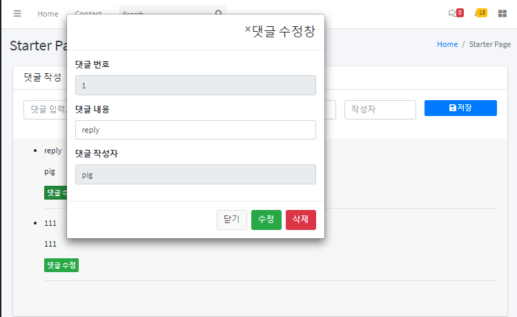 $("#replies").on("click", ".replyLi button", function () { var reply = $(this).parent(); var reply_no = reply.attr("data-reply_no"); var reply_text = reply.find(".reply_text").text(); var reply_writer = reply.find(".reply_writer").text(); $("#reply_no").val(reply_no); $("#reply_text").val(reply_text); $("#reply_writer").val(reply_writer); });위의 script를 추가한 뒤 댓글수정 버튼을 눌러보면 아래와 같은 Modal 창을 확인할 수 있습니다. Modal 창에는 해당 댓글의 번호, 댓글 내용, 댓글 작성자가 출력되는 것을 확인할 수 있습니다.