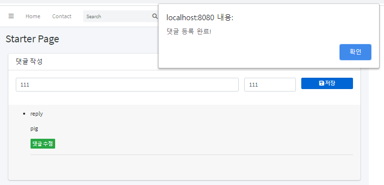 $(".replyAddBtn").on("click",function() { // 화면으로부터 입력 받은 변수값의 처리 var reply_text = $("#newReplyText"); var reply_writer = $("#newReplyWriter"); var reply_textVal = reply_text.val(); var reply_writerrVal = reply_writer.val(); // AJAX 통신 : POST $.ajax({ type : "post", url : "${path}/replies", headers : { "Content-type" : "application/json", "X-HTTP-Method-Override" : "POST" }, dataType : "text", data : JSON.stringify({ article_no : article_no, reply_text : reply_textVal, reply_writer : reply_writerrVal }), success : function (result) { // 성공적인 댓글 등록 처리 알림 if (result == "regSuccess") { alert("댓글 등록 완료!"); } getReplies(); // 댓글 목록 출력 함수 호출 reply_text.val(""); // 댓글 내용 초기화 reply_writer.val(""); // 댓글 작성자 초기화 } }); });이제 댓글 등록 처리를 테스트 해보면 정상적으로 등록되고 목록에도 정상적으로 출력되는 것을 확인할 수 있습니다.