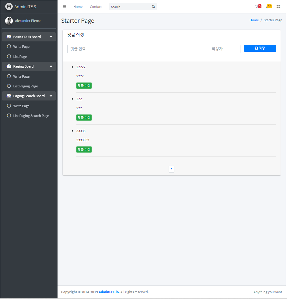 // 3번째 게시글 var article_no = 3; // 댓글 목록 호출 getReplies(); // 댓글 목록 출력 함수 function getReplies() { $.getJSON("${path}/replies/all/" + article_no, function (data) { console.log(data); var str = ""; $(data).each(function () { str += "<li data-reply_no='" + this.reply_no + "' class='replyLi'>" + "<p class='reply_text'>" + this.reply_text + "</p>" + "<p class='reply_writer'>" + this.reply_writer + "</p>" + "<button type='button' class='btn btn-xs btn-success' data-toggle='modal' data-target='#modifyModal'>댓글 수정</button>" + "</li>" + "<hr/>"; }); $("#replies").html(str); }); }이제 정상적으로 댓글이 출력되나 확인해보겠습니다.