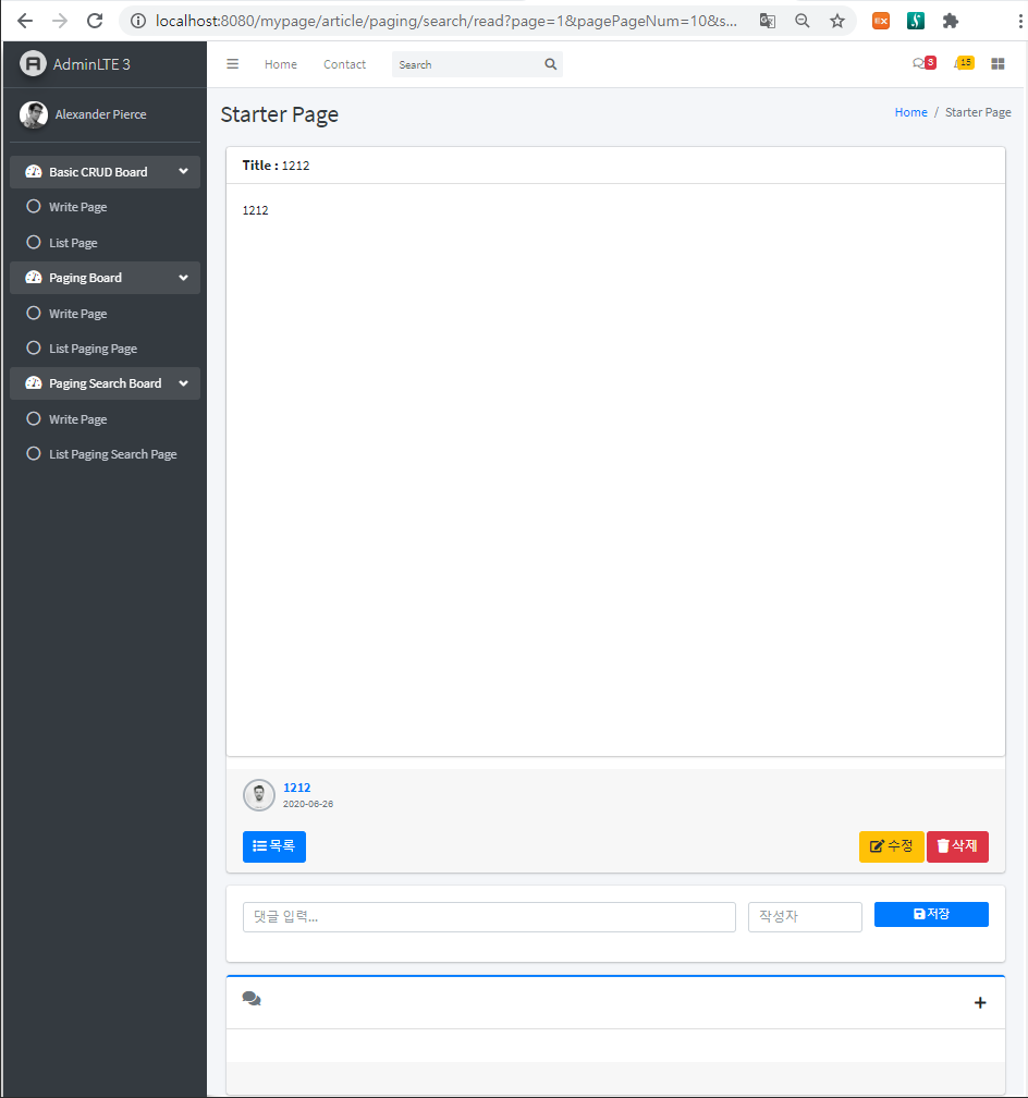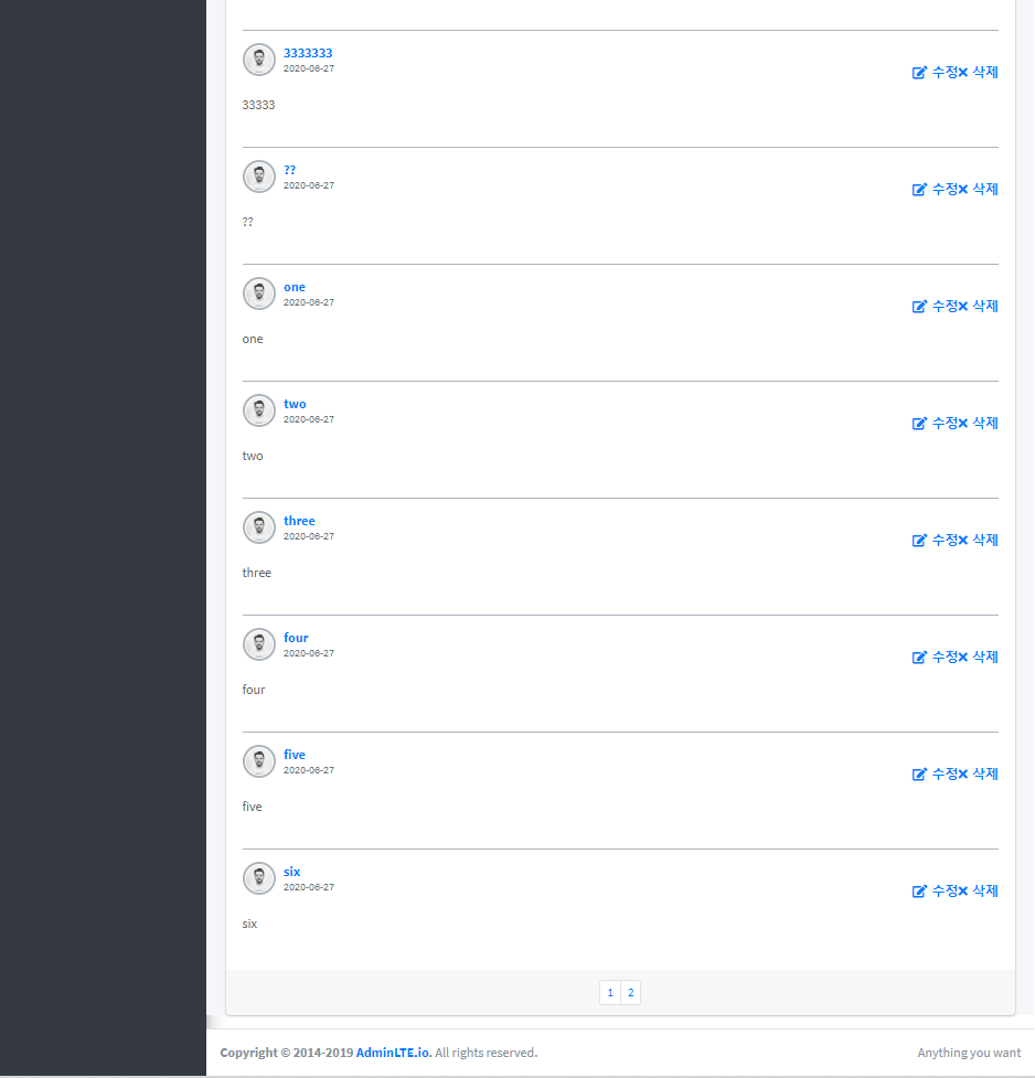 <div class="card-body"> <form class="form-horizontal"> <div class="row"> <div class="form-group col-sm-8"> <input class="form-control input-sm" id="newReplyText" type="text" placeholder="댓글 입력..."> </div> <div class="form-group col-sm-2"> <input class="form-control input-sm" id="newReplyWriter" type="text" placeholder="작성자"> </div> <div class="form-group col-sm-2"> <button type="button" class="btn btn-primary btn-sm btn-block replyAddBtn"> <i class="fa fa-save"></i> 저장 </button> </div> </div> </form> </div>1-2. 댓글 목록 페이징 영역
